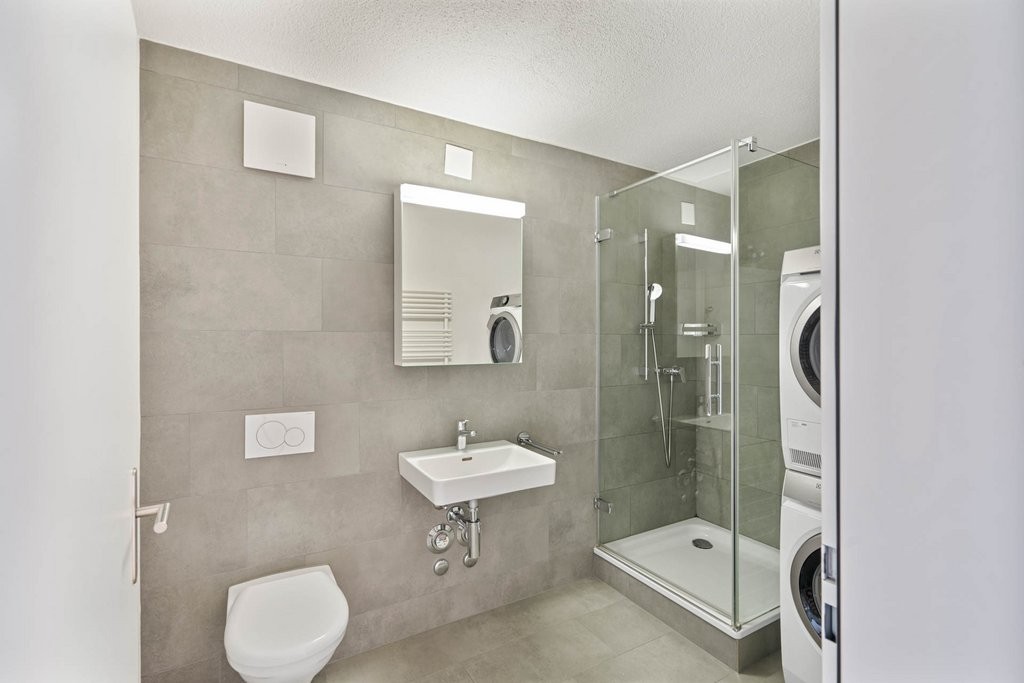 - Badezimmer mit Dusche und eigenem Waschturm (Waschmaschine/Tumbler)